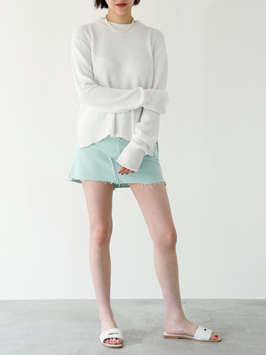 表情を明るく、好印象に導いてくれそうな淡い水色のサマーニットに、