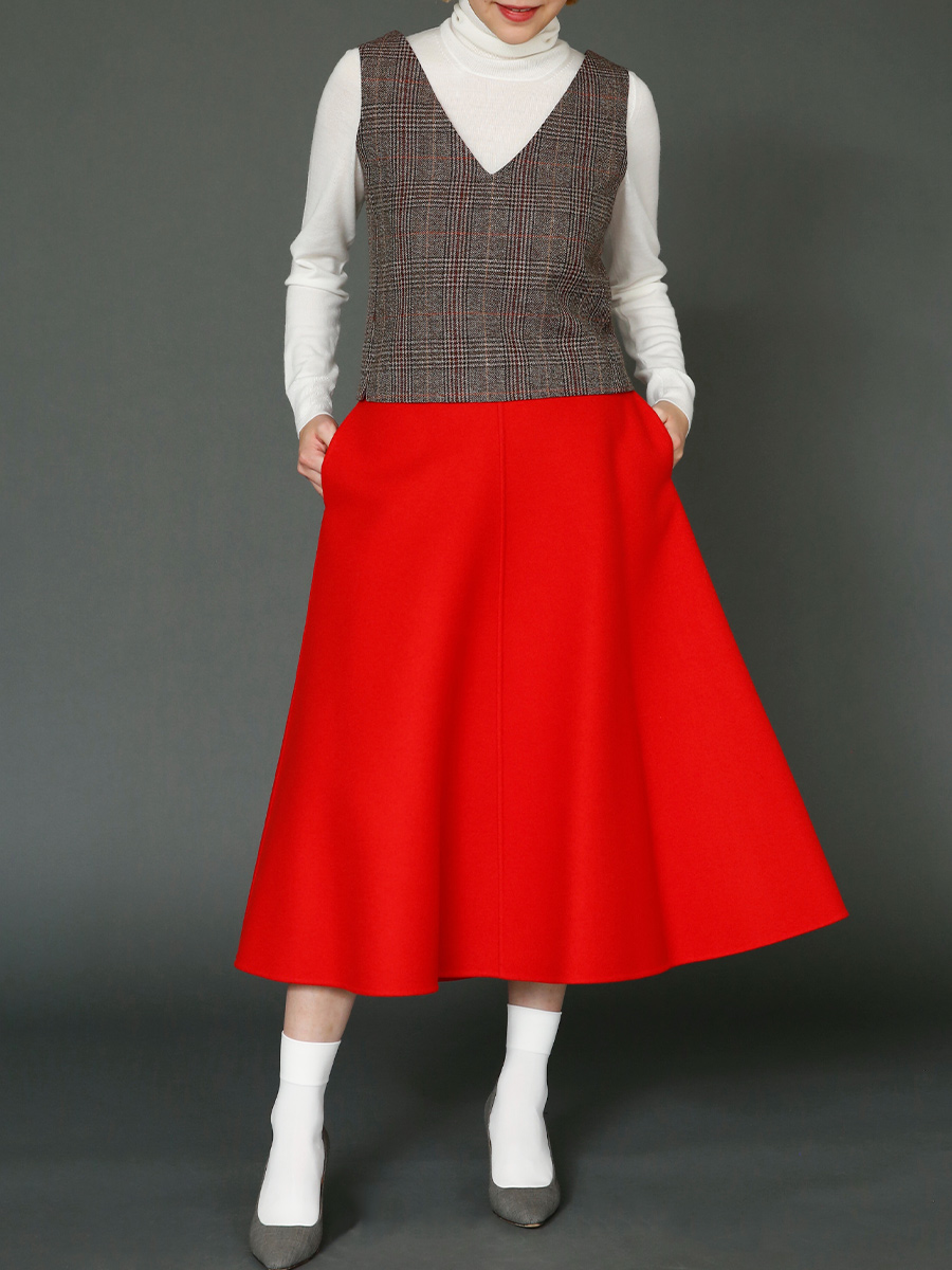 鮮やかな赤のスカートを加えることで、新鮮さと温度を感じる着こなしへ。