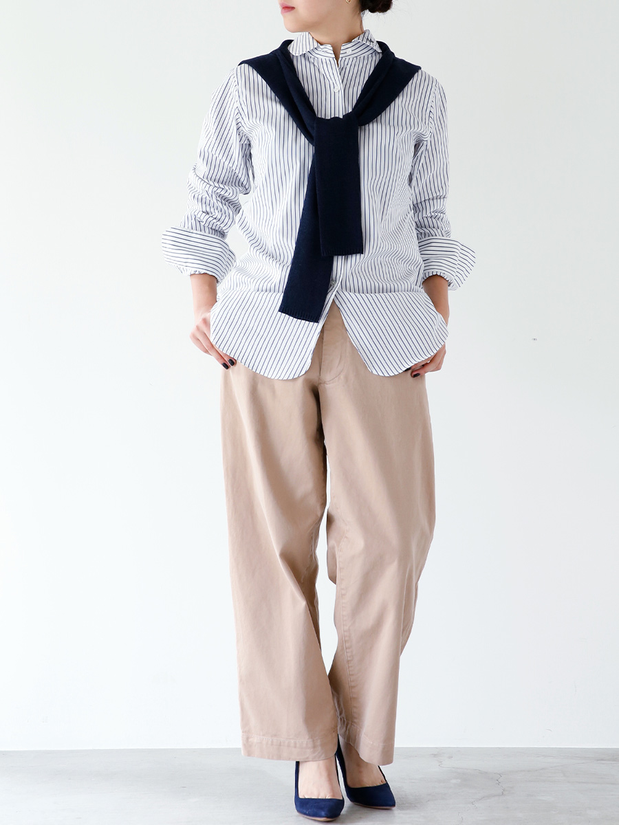 夏の名残を感じさせる爽やかなストライプシャツは、軽やかな素材感で、残暑も快適に過ごせます。秋に向けては、シャツの上から薄手のニットを肩掛けすることで、季節の変わり目にぴったりの装いに。