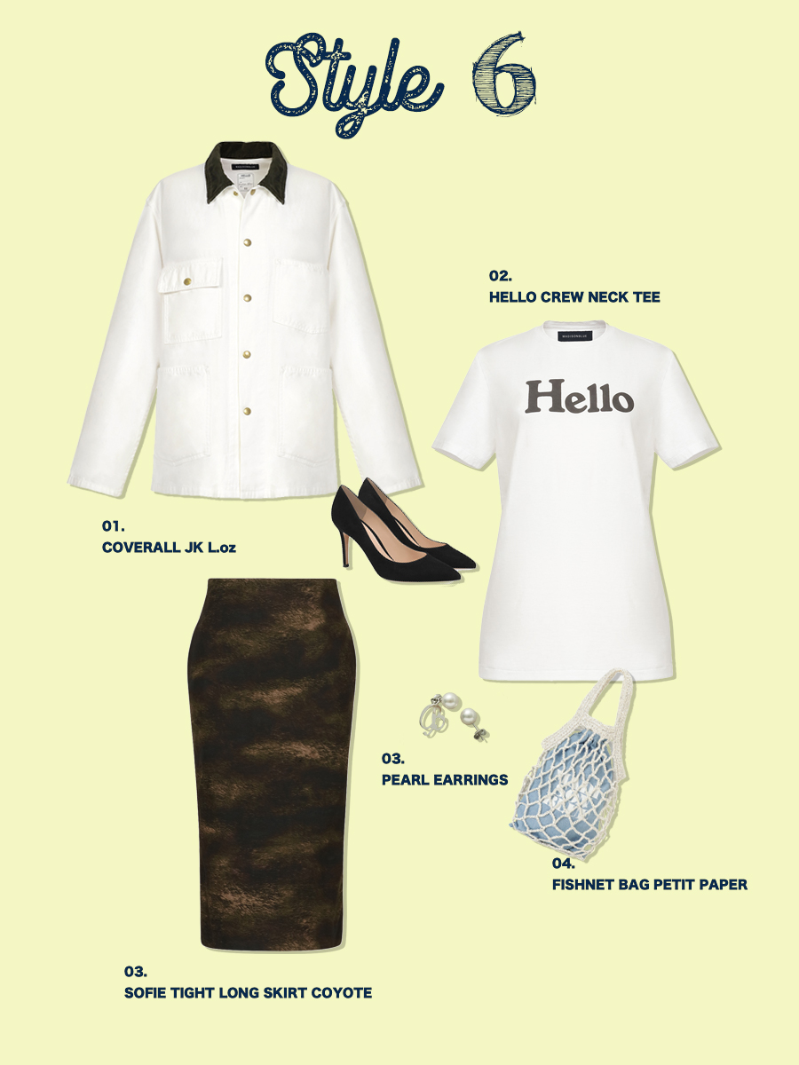 フェミニンなタイトスカートと、タフな印象のカバーオールのミックススタイル。襟とスカートのカーキを共通点に相反する要素をスムーズに繋ぐ。COVERALL JK L.oz BS